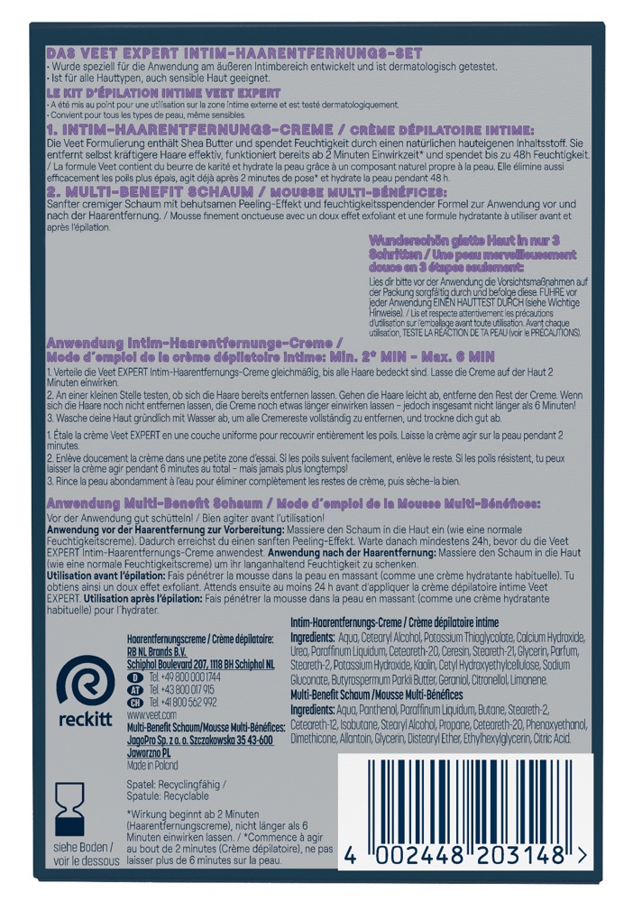Mit dem Veet EXPERT Intim-Haarentfernungs-Set lassen sich störende Körperhaare in der gesamten äusseren Intimzone effektiv und schnell entfernen. Das Set enthält die EXPERT Intim-Haarentfernungscreme, die speziell für die sensible Haut im äusseren Intimbereich entwickelt wurde und selbst kräftigere Haare bereits ab einer Einwirkzeit von 2 Minuten entfernt. Die Formel mit Shea Butter spendet der Haut bis zu 48 Stunden Feuchtigkeit. Ergänzend sorgt der EXPERT Multi-Benefit-Schaum für eine optimale Vor- und Nachbehandlung. Der sanft-cremige Schaum mit mildem Peeling-Effekt und beruhigender Wirkung vervollständigt die Haarentfernungsroutine.