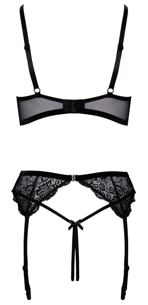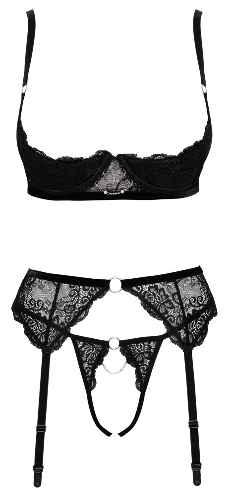 Hebe, Strapsgurt und String ouvert vereint im Set von Cottelli LINGERIE. Alles aus feiner weicher schwarzer Stretch-Spitze gearbeitet und mit silberfarbenen Ringen sowie edlen Samt-Details versehen. Zwischen den Hebe-Cups und in der offenen String-Front zusätzlich mit Kettchen und Perlen verziert, die allesamt auch abnehmbar sind. Die leicht gefütterte Bügel-Hebe setzt den Busen aufregend in Szene. Die Träger und der Hakenverschluss im Rücken sind passend verstellbar. Taillen-Strapsgurt mit verstellbaren Strumpfhaltern und Hakenverschluss hinten. Der kleine Spitzen-String verführt mit seinem komplett offenem Schritt und kleiner Schleife über dem Po.