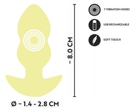 Der Vibrating Mini Butt Plug Yellow von Cuties ist das freche Abenteuer für alle, die analen Genuss spielerisch entdecken möchten. Im federleichten Design mit schmaler Spitze gleitet der kompakte Silikon-Plug wie von selbst und macht den Einstieg super einfach. Sanfte Abstufungen und Rillenstrukturen sorgen für ein aufregendes Gefühlserlebnis. 7 intensive Vibrationsmodi bringen prickelnde Abwechslung und jede Menge Vergnügen ins Spiel. Einfach nur aufs Knöpfchen drücken!