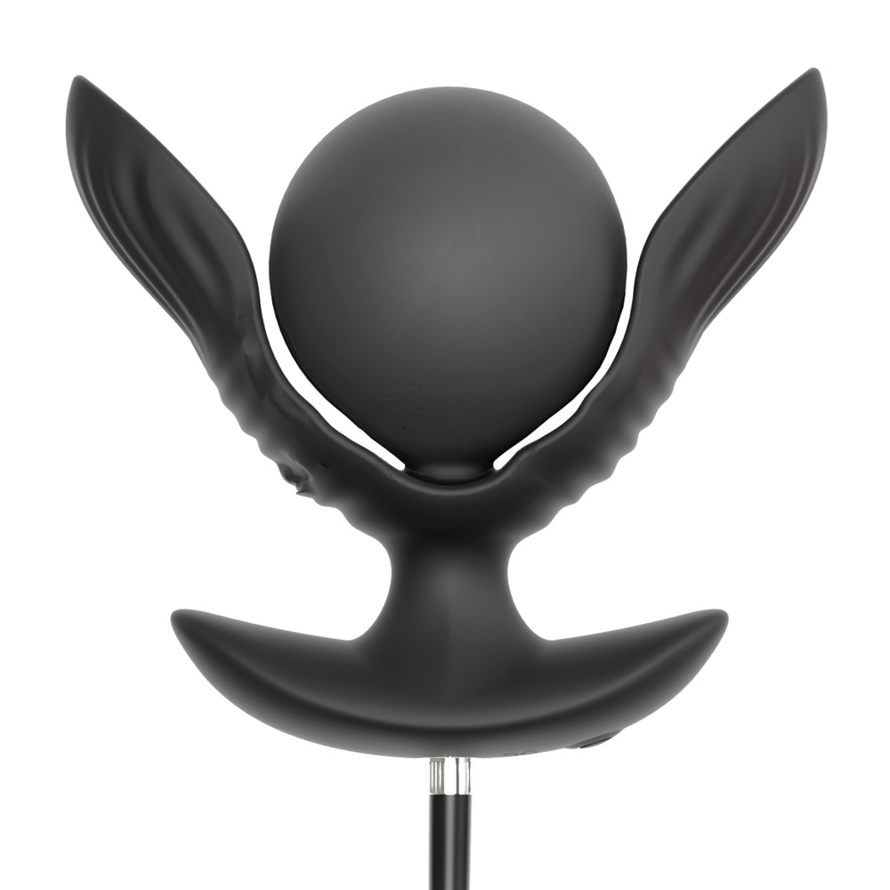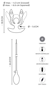 RC Inflatable Expander Plug with Vibration von ANOS für lustvolles Dehnen und intensive Stimulation im Hinterstübchen. Der 2-armige Plug wird mit seinen zusammengedrückten Vibro-Spitzen eingeführt. Er überrascht mit einem aufpumpbaren Mittelball, um die geriffelten Plug-Arme dann weit auseinander zu spreizen. Mit der griffigen Ballpumpe wird dieser bequem auf Wunschgrösse gebracht – so breitet sich der Plug im Analkanal lustvoll aus. Dazu sorgen 2 leise, dennoch leistungsstarke Motoren für prickelnde Vibrationen in den Plug-Armen, die richtig tief gehen.