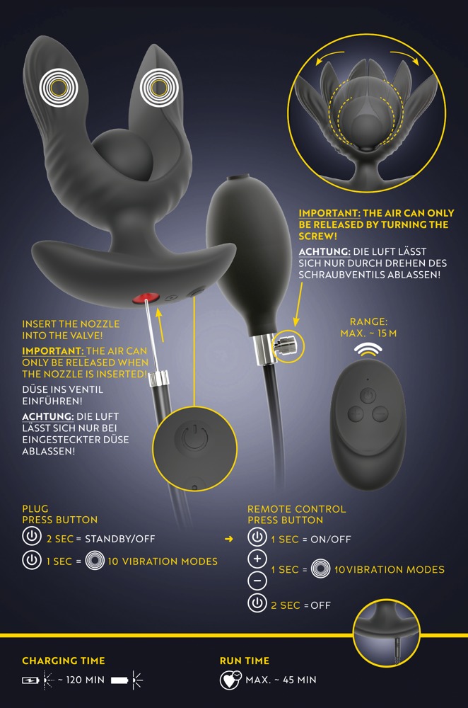 Mit der praktischen Fernbedienung sind 10 Vibrationsmodi bequem steuerbar. Bei einer Reichweite von 15 Metern auch vom Partner oder der Partnerin. Die Vibrationen können auch direkt am Toy per Knopfdruck gesteuert werden. Die handliche Ballpumpe mit Sicherheits-Druckregler ist vom Plug abnehmbar. Ein selbstschliessendes Ventil hält die Luft auch dann sicher im Plug.