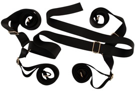 Das robuste, verstellbare Gurtkreuz wird einfach unter die Matratze gelegt. An die End-Ringe der Gurte werden dann die stylischen Fesseln mit ihren Karabinern eingehakt. Die weichen, bequemen Manschetten für Hände und Füsse sind mit den Schnallenverschlüssen schnell angelegt und passend verstellbar. Die blickdichte, komfortable Augenmaske mit breitem Kopf-Stretchband ist schnell aufgesetzt und macht das Fesselspiel noch aufregender und intensiver.