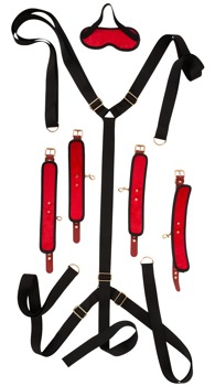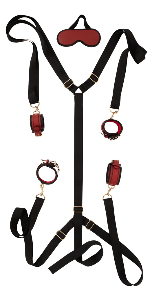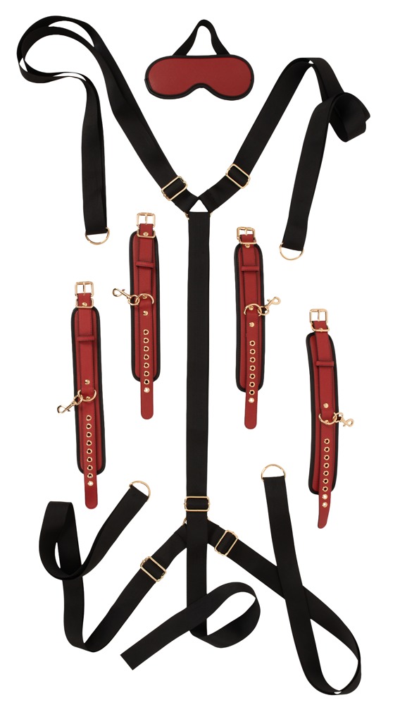 6-teiliges Set: 1 Gurtkreuz, 2 Handfesseln, 2 Fussfesseln, 1 Augenmaske.