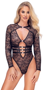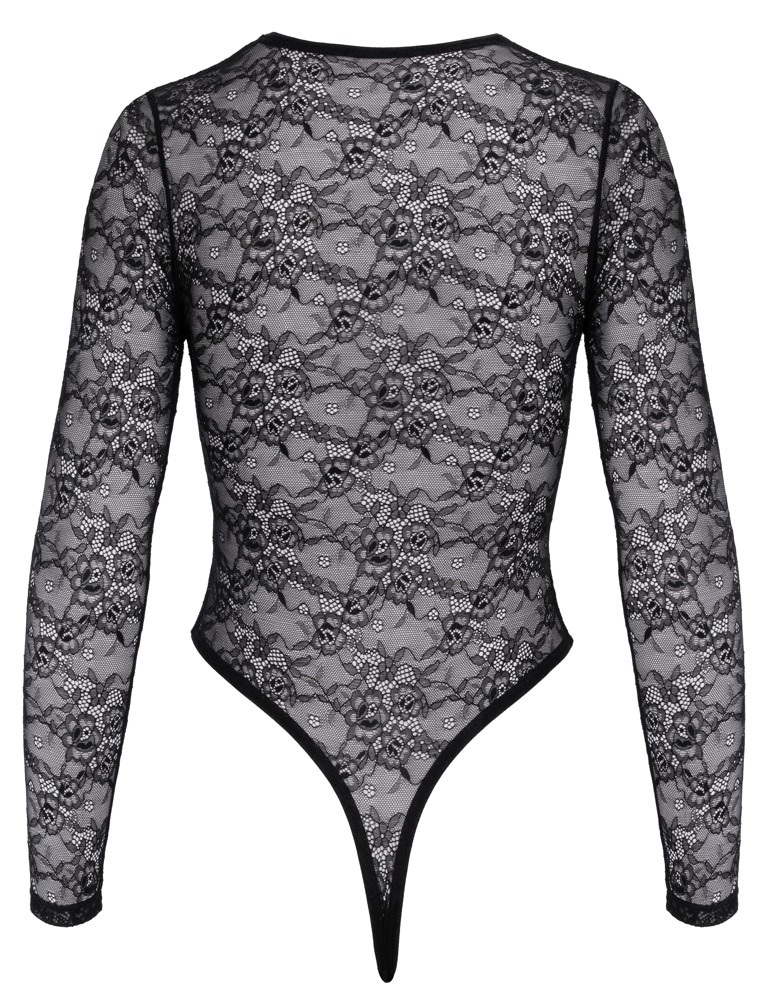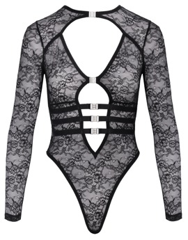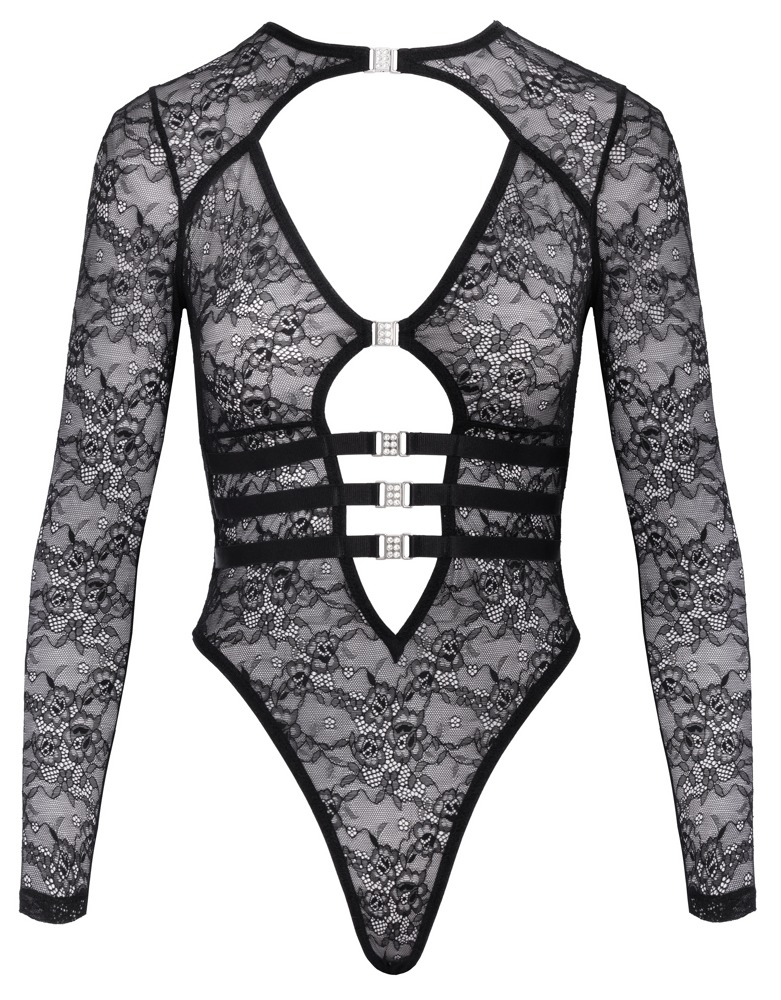 Langarm-Riobody von La Finesse DESSOUS in feiner schwarzer Spitzen-Transparenz. Rundum elastisch und weich anschmiegsam für höchsten Tragekomfort. Vorne bis zum Bauchnabel tief ausgeschnitten und mit 5 dekorativen Strassschliessen zum Öffnen versehen. Der Rio-Style mit hohen Beinausschnitten bringt Po und Beine optimal zur Geltung. Im Schritt mit praktischem Hakenverschluss.