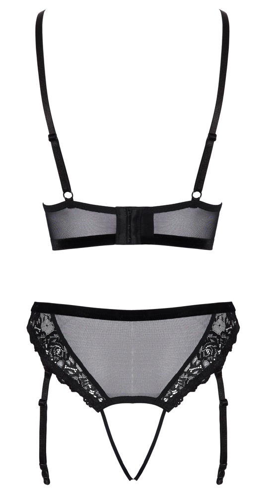 Bralette und Straps-Slip ouvert im Set von Cottelli LINGERIE im schwarzen feinen Mix aus Spitze und Powernet. Rundum weich und elastisch für hohen Tragekomfort. Der länger geschnittene BH punktet mit seinen Stretchriemchen im Dekolleté, der Taillen-Slip mit seinem komplett offenem Schritt. Die Träger sind passend verstellbar, genauso wie die Strumpfhalter, die vom Slip auch komplett abnehmbar sind.