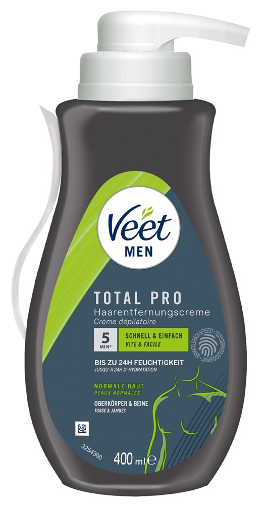 Die Veet Men TOTAL PRO Haarentfernungscreme ermöglicht eine schnelle und effektive Entfernung unerwünschter Haare an Oberkörper und Beinen. Die dermatologisch getestete Formel sorgt für eine spürbar glatte Haut und spendet bis zu 24 Stunden pflegende Feuchtigkeit. Die Creme entfernt die Haare in nur 5 bis 10 Minuten für ein langanhaltendes Ergebnis mit weniger juckender Stoppelbildung und weniger eingewachsenen Haaren im Vergleich zur Rasur. Nach der Anwendung verbleibt kein unangenehmer Geruch auf der Haut.