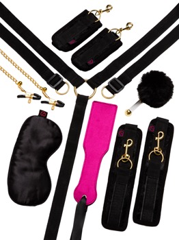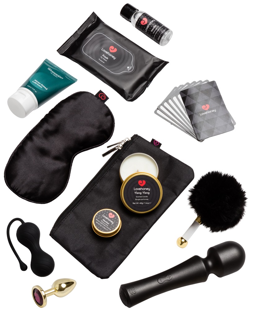 Enthalten sind: 3 x Premium-Toys, 2 x Vibro-Toys, 6 x Toys, 3 x Anal-Toys, 3 x Drogerie, 2 x Accessoires, 5 x Soft Bondage.
