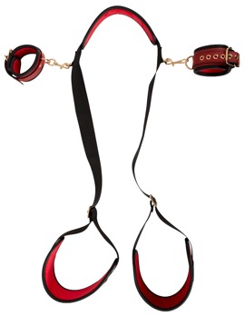 Die kombinierte Fessel verbindet einen gepolsterten Nackengurt mit längenverstellbaren Gurtschlaufen für die Schenkel. Zusätzlich sorgen abnehmbare Handfesseln für den extra fesselnden Kick. Weiches Lederimitat und softe Polsterungen bieten dabei höchsten Komfort – perfekt für längere Sessions.