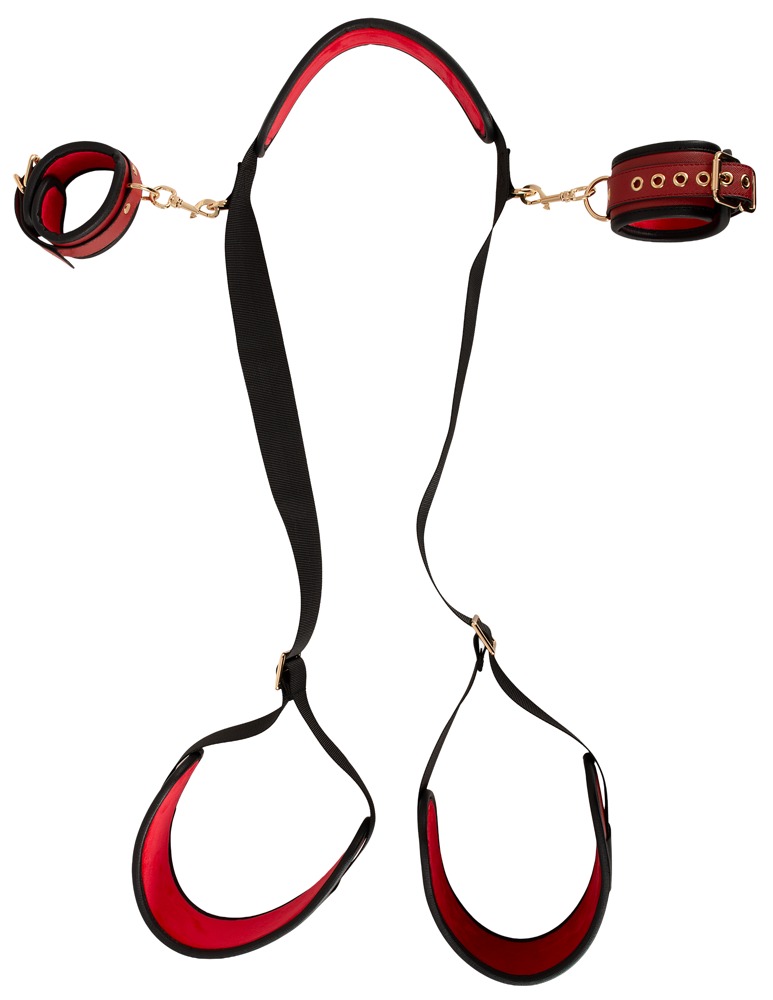Das Neck-Thigh-Restraint-Set von Bad Kitty begeistert durch seine luxuriöse Optik in elegantem Schwarz und Rot mit feinstem Lederimitat und goldfarbenen Accessoires. Dieses schnell einsetzbare Set ist ein echtes Highlight und bietet vielfältige Möglichkeiten für aufregende Positionsspiele und Fesselungen!