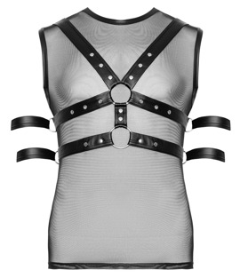 Ärmeloses Shirt und Brust-Harness sowie 4 Hand-/Armfesseln im schwarzen Set von Svenjoyment BONDAGE. Anschmiegsames Shirt vorne aus feinem Powernet und hinten im Mattlook gearbeitet. Ausschnitte im Mattlook eingefasst. Rundum weich und elastisch für hohen Tragekomfort. Brust-Harness mit verstellbaren Mattlook-Riemen (Druckknöpfe). Jeweils seitlich am Brust- sowie Bauchgurt mit Ringen, durch die beiliegende Fesselmanschetten durchgezogen werden können. Die soften Fesselmanschetten sind mit ihren Klettverschlüssen schnell angelegt und angepasst.