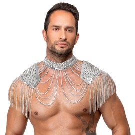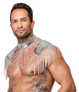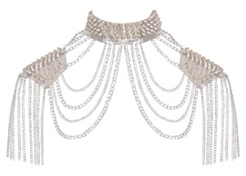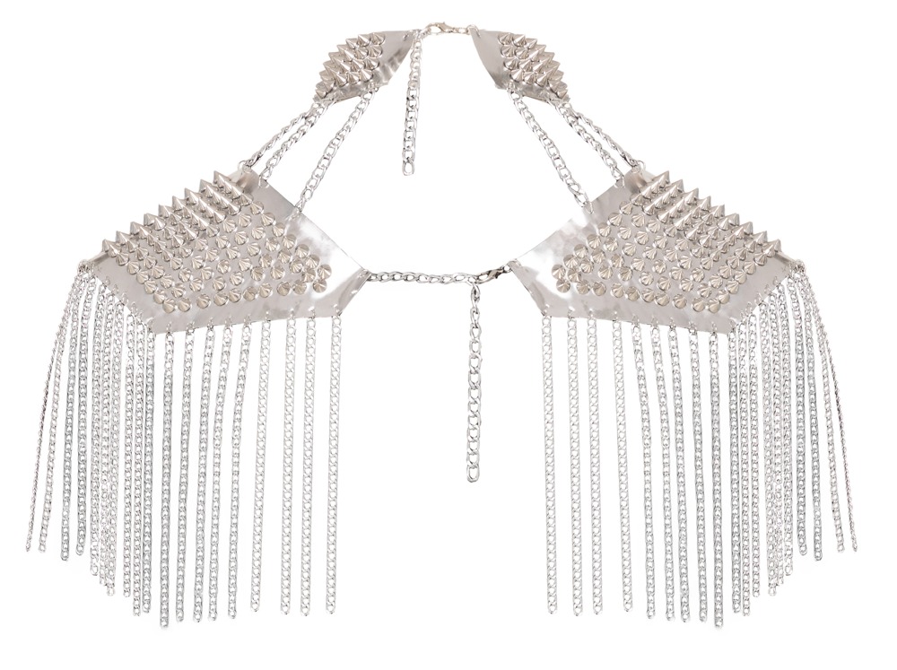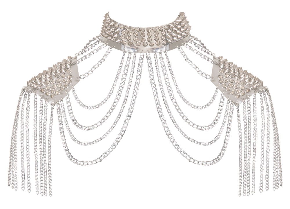 Auffälliger silberfarbener Kettenkragen von Bad Kitty aus verschiedenen Ketten- und Schmuckelementen sowie glänzenden stumpfen Spikes. Der aufwändig gearbeitete Körperschmuck ziert den Hals, liegt angenehm auf den Schultern und umspielt die Oberarme – wie ein glamouröser Bolero oder eine schillernde Rüstung. Der Schmuck betont sowohl die Vorder- als auch die Rückseite des Körpers. Unisex – mit Karabinerverschlüssen individuell verstell- und anpassbar. Ob solo für einen erotischen Auftritt oder mit enganliegenden Outfits stylisch kombiniert: Dieser extravagante Kettenschmuck ist stets ein Blickfang!