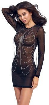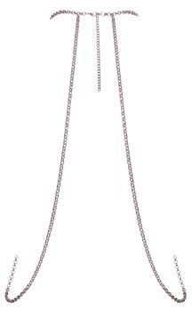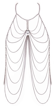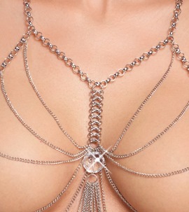 Silberfarbene Körperkette von Cottelli ACCESSOIRES mit üppigem Kettchenbesatz vorne. Als zusätzlicher Eyecatcher ein grosser klarer Schmuckstein zwischen den Brüsten. Neckholder mit Karabinerverschluss. Ob solo als Dessous getragen für einen erotischen Auftritt oder mit Bademode und enganliegenden Outfits stylisch kombiniert – der glamouröse Körperschmuck ist stets ein Blickfang!
