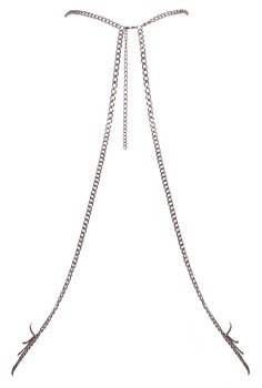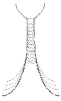 Silberfarbene Körperkette von Cottelli ACCESSOIRES mit üppigem Kettchenbesatz zwischen den Brüsten und Kettenbesatz über den Hüften. Im Nacken mit Karabinerverschlüssen individuell verstell- und anpassbar. Ob solo als Dessous getragen für einen erotischen Auftritt oder mit Bademode und enganliegenden Outfits stylisch kombiniert – der glamouröse Körperschmuck ist stets ein Blickfang!