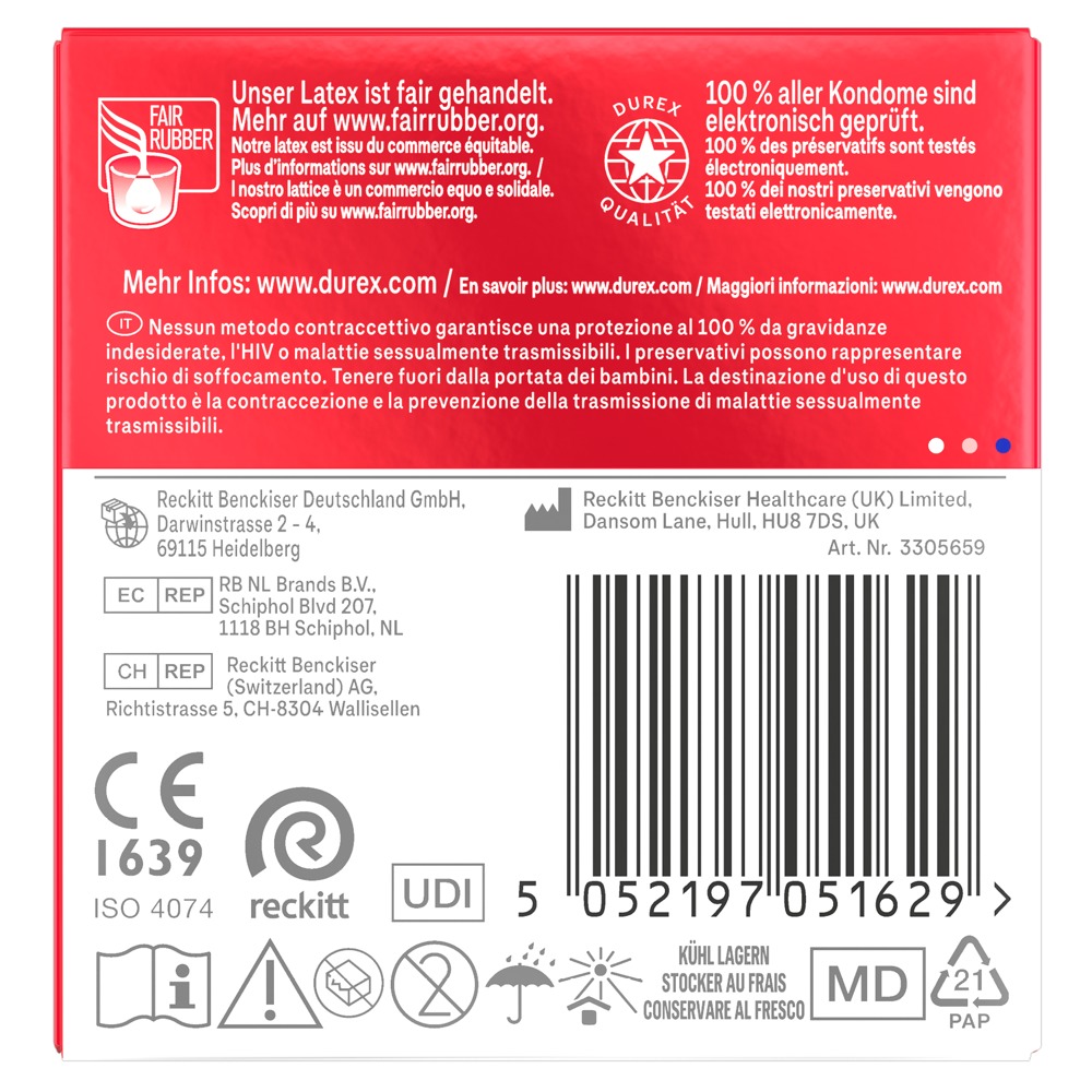 Transparente Kondome Gefühlsecht Classic von Durex aus Naturkautschuklatex mit Feuchtbeschichtung auf Silikonbasis. Im Vergleich zu herkömmlichen zylindrischen Kondomen bietet die innovative anatomische Easy-on-Form der Durex-Kondome an den richtigen Stellen etwas mehr Platz und gewährleistet so ein leichteres Anlegen und Abrollen sowie komfortablen Sitz und intensives Empfinden.