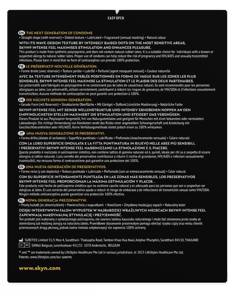 Hauchdünne Transparenz für noch mehr Gefühl: genoppte, Kondome Manix SKYN Intense Feel mit Feuchtbeschichtung auf Silikonbasis. Vegan. Das Polyisopren-Material der Kondome wird Skynfeel genannt und ist weicher und elastischer als Latex, dabei aber genauso stabil und kommt ohne den klassischen Latexgeruch aus. Es ist somit ideal für Latexallergiker geeignet.