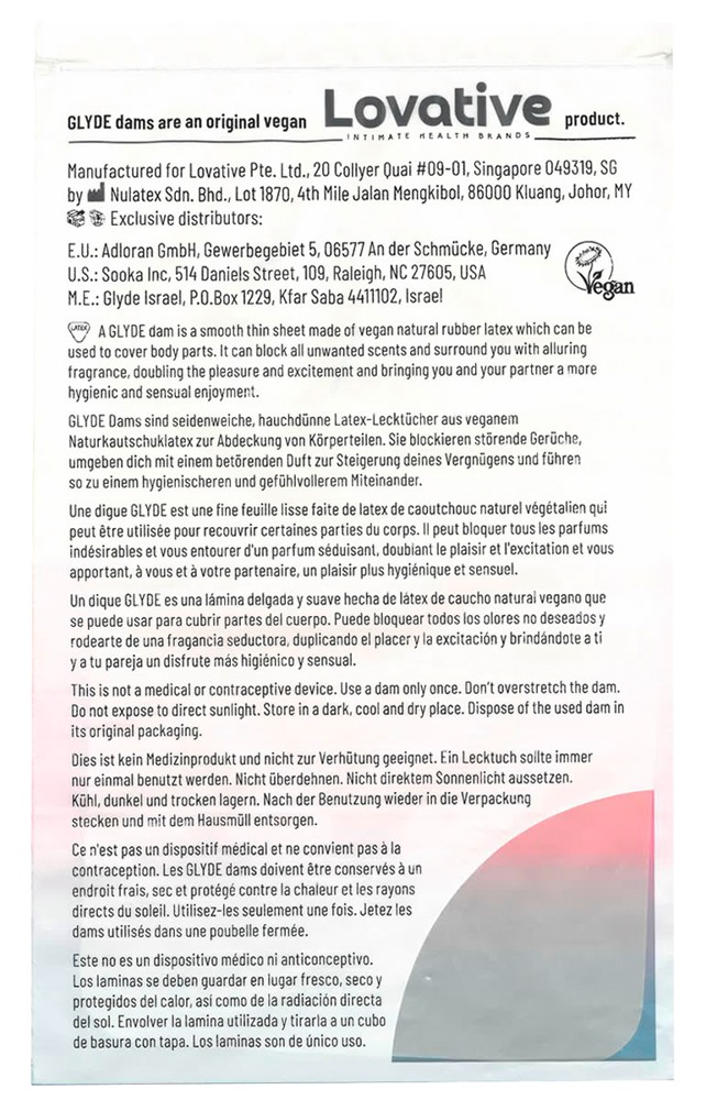 Die GLYDE Dams VANILLA bieten zuverlässigen, hygienischen Schutz und hohen Komfort beim Oralverkehr. Die veganen, cremefarbenen Lecktücher aus Naturkautschuklatex sind hauchdünn und seidenweich für ein gefühlsechtes, komfortables Erlebnis. Mit einer grosszügigen Grösse von 25 x 15 cm bieten die Schutztücher eine umfassende Abdeckung beim Cunnilingus und Rimming. Das dezente Vanille-Aroma unterstreicht dabei mit warmer sinnlicher Note den ganz besonderen Moment. Für maximale Hygiene sind die Lecktücher einzeln verpackt und in der praktischen, runden Box schnell einsatzbereit.