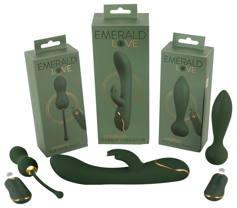 Luxurious RC Love Balls von Emerald Love by You2Toys für tiefgehende Vagina-Stimulationen und ein effektives Beckenboden-Training. Die leistungsstarken Liebeskugeln vibrieren ganz leise und sind somit diskret tragbar. Niemand bemerkt das intensive intime Geheimnis! Die luxuriösen Vibro-Liebeskugeln im smaragd-grünen Edel-Design mit goldfarbenen Details überzeugen zudem mit ihrer griffigen Rautenstruktur und simpelster Bedienung.