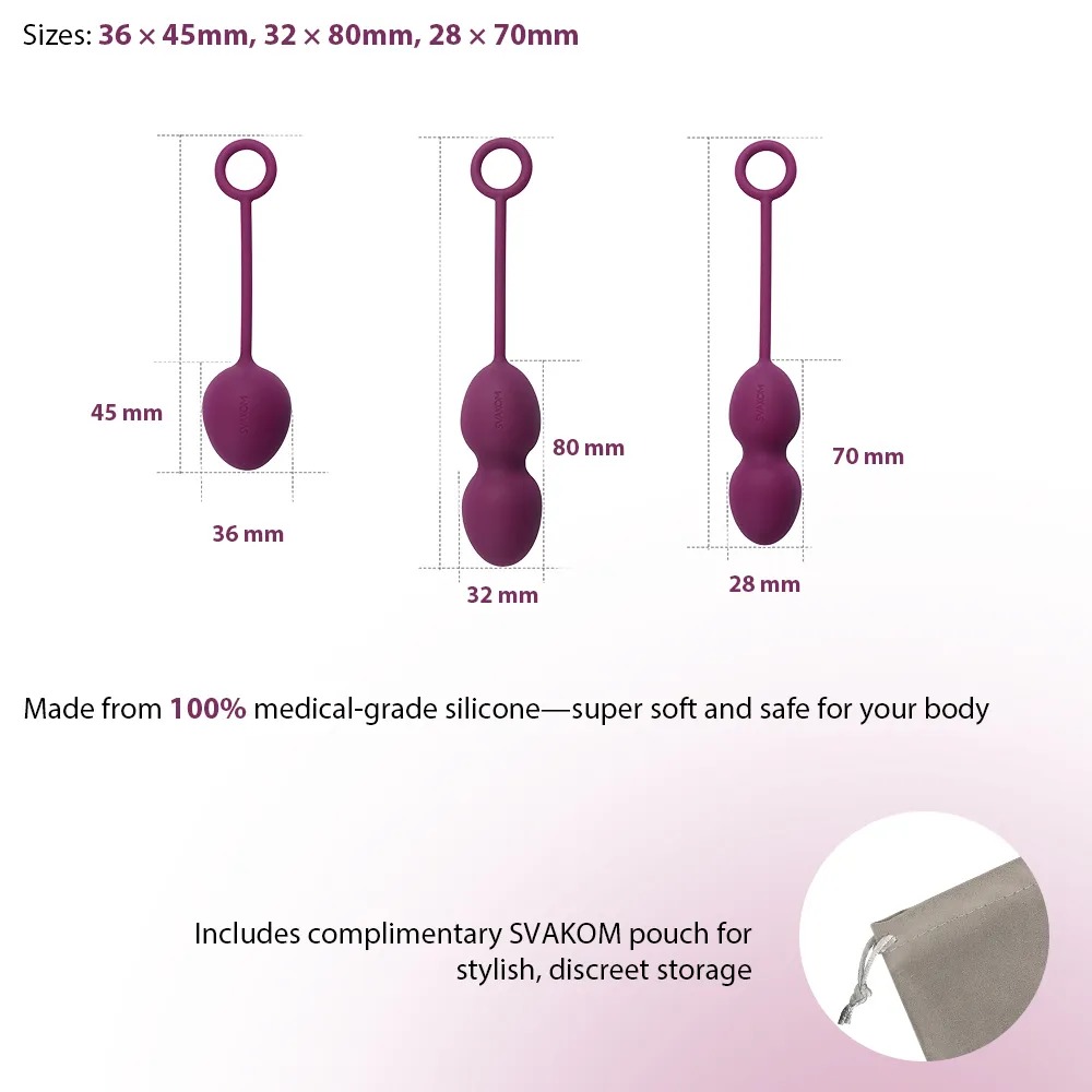 Liebeskugel-Set bestehend aus 1 Einzelkugel und 2 Kugel-Duos zur Stärkung des Beckenbodens. Mit 3 aufeinander folgenden Gewichtsstufen für ein effektives Training. Gleichzeitig wird der Durchmesser der Kugeln immer kleiner, so dass der Beckenboden verstärkt arbeiten muss, um die Kugeln an Ort und Stelle zu halten. Dazu lösen im Inneren rotierende Kugelgewichte bei jeder Bewegung Schwingungen aus, die zu kräftigenden Muskelkontraktionen führen. Ideal nach der Schwangerschaft und zur Vorbeugung von Inkontinenz. Die wasserdichten Liebeskugeln überzeugen mit der seidigen Soft Touch Textur und dem elastischen Rückholband inklusive Ring.