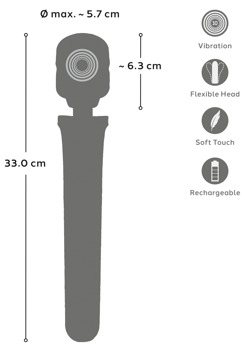Gesamtlänge 33 cm, Massagekopf 6,3 cm lang, Ø 5,7 cm.