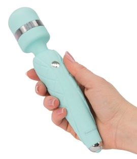 Türkisfarbener, wiederaufladbarer Vibrostab mit beweglichem Massagekopf für gezielte Lustpunkt- oder Ganzkörper-Massagen. Extra starker Motor für stufenlos steuerbare Vibrationsgeschwindigkeit. Mit Reisesperre. Edles Detail: Funkelnder Swarovski®-Stein als Bedienknopf. Gesamtlänge 20 cm, Ø 3,9 cm.