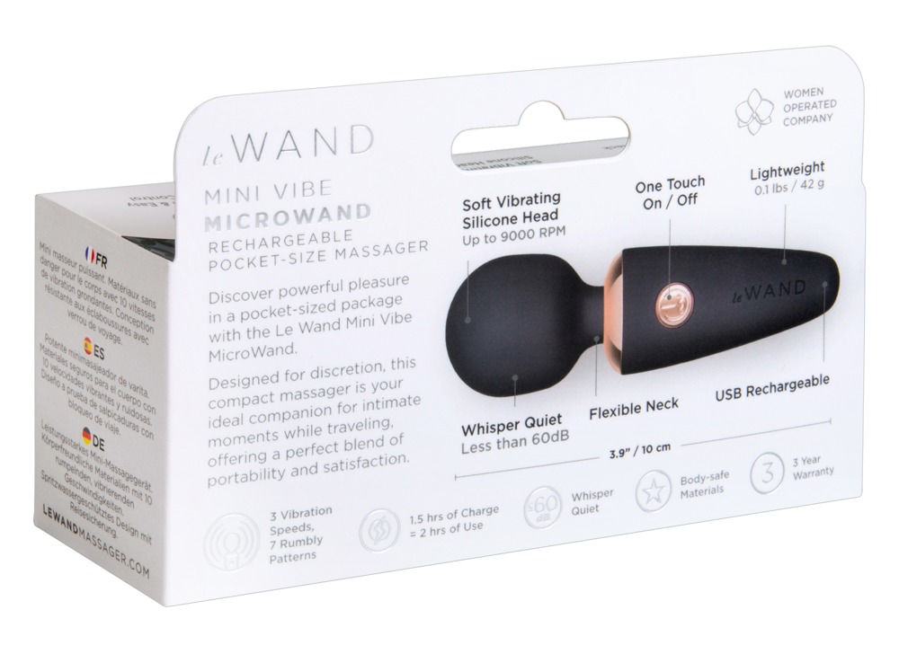 Diskreter, flüsterleiser Mini Vibe Microwand von le Wand mit kraftvoller Vibration im Massagekopf. Mit seidiger Soft Touch Textur überzogen, gleitet der Mini-Massager wie von selbst über die Haut. 7 vielseitige Vibrationsmodi in 3 Intensitäten verwöhnen intensiv bei Körper- und Intimmassagen – allein oder zu zweit. Dabei liegt der kleine Massagestab perfekt in der Hand und lässt sich mit der One-Button-Steuerung einfach bedienen. Mit seinem eleganten Design, den kompakten Massen und dem leichten Gewicht ist er immer griffbereit und überall dabei – zuhause und unterwegs!
