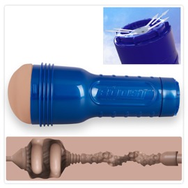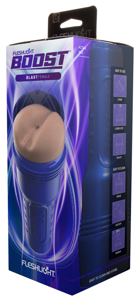 Griffiger Masturbator Boost Blast von Fleshlight in diskretem Gehäuse mit lebensecht detaillierter Anus-Öffnung. Innenliegende schwebende Turbo Tech Ringe umschliessen den Penis schön fest und sorgen für perfekten Halt. Das sehr abwechslungsreich strukturierte Innenleben mit verschiedenen Durchmessern massiert den Penis intensiv und orgasmuswirksam beim Handjob. Mit der beiliegenden Suction Control Cap kann bequem die Saugwirkung individuell gesteuert werden.