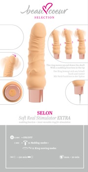 Der energiegeladene SELON Soft Real Stimulator EXTRA von beau cœur kommt mit seinem realistisch strukturierten Design einem echten Penis täuschend nah – und fühlt sich auch genauso streichelweich und seidig an! Bequem per Knopfdruck startet der SELON dann seine kraftvolle Action mit prickelnder Vibration, intensiv nickender Eichel und sich auf und ab bewegendem Move-Massagering. Das komplette Vagina-Verwöhnprogramm! Einfach einführen und geniessen …