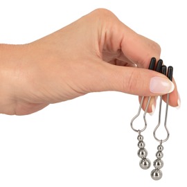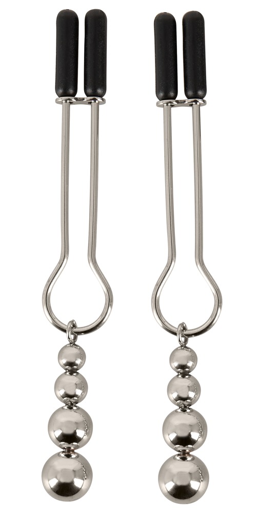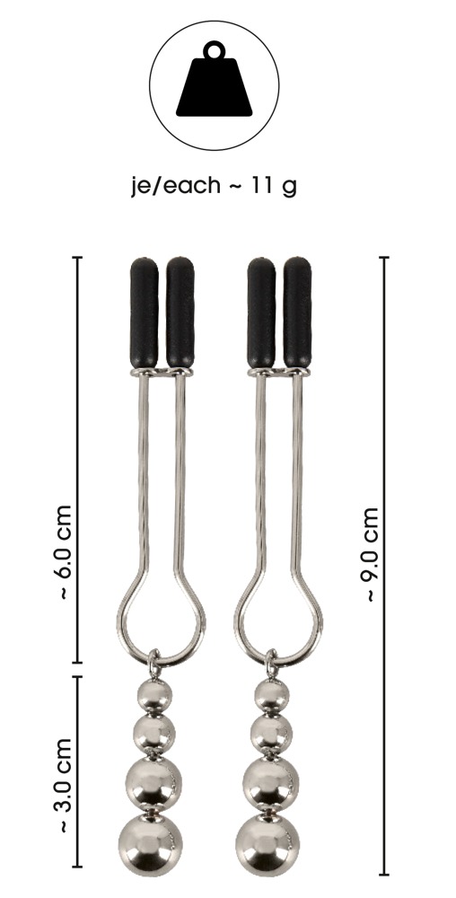 Die Nipple Clamps von Accessoire Bizarre nehmen die Brustwarzen fest in die Zange und schmücken sie mit jeweils 4 Schmuckkugeln. Die Nippelklemmen sind in der Druckstärke individuell mit den Schieberingen justierbar. Die soften Überzüge sorgen dabei für mehr Tragekomfort. Jeweils 11 g leicht – perfekt für Nippelplay-Neulinge! Und für Experimentierfreudige – lustvolles Ziepen auch an Klitoris, Hoden oder anderen erogenen Zonen.
