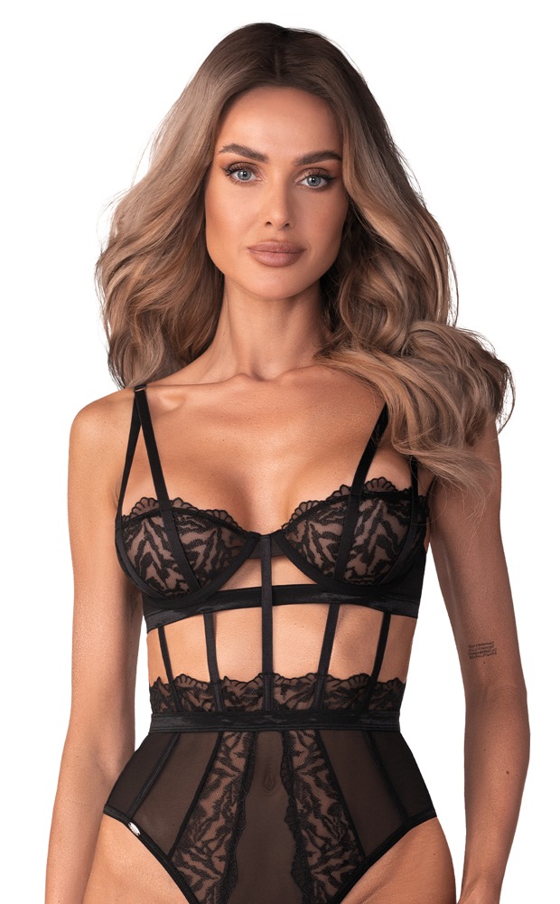 Schwarzer Body ouvert Hersis von Obsessive aus zarter Spitze mit transparenten Einsätzen. Weich und elastisch in extravaganter Riemen-Optik. Mit Bügel-Cups für ein schönes Dekolleté. Die raffinierten Träger und der BH-Hakenverschluss im freien Rücken sind passend verstellbar. Der aufregend po-freie Einteiler ist zusätzlich hinten in der Taille mit einer Schmuckschliesse versehen. Die Strings im komplett offenen Schritt sind ebenfalls passend verstellbar.
