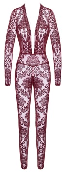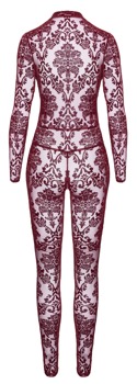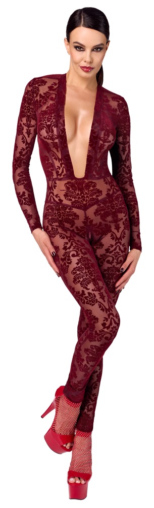 Hautenger Langarm-Overall Kink Royal von Noir in atemberaubender burgundroter Transparenz mit samtigen Flockprint-Ornamenten. Rundum elastisch und weich anschmiegsam für hohen Trage- und Bewegungskomfort. Extra tief dekolletiert und mit diskretem Reissverschluss im Schritt.