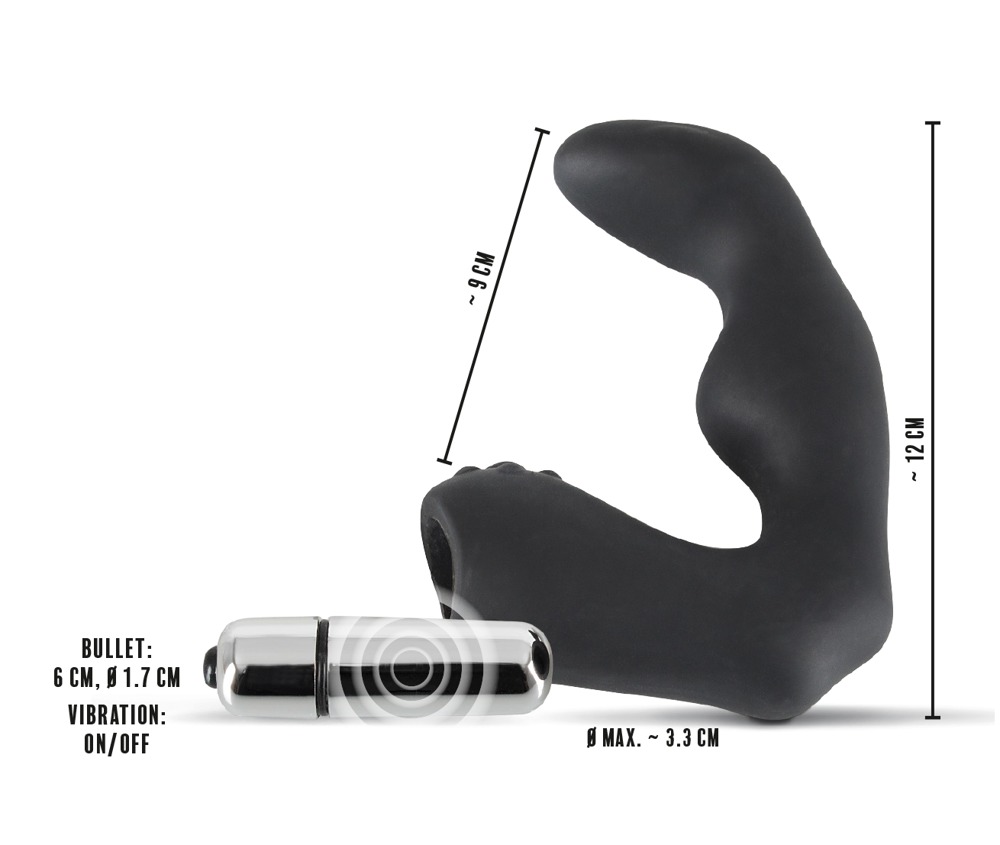 L-förmiger Vibrator mit Noppen und Verdickungen am Schaft. Das Vibroei ist entnehmbar. Schwarz/Silberfarben.