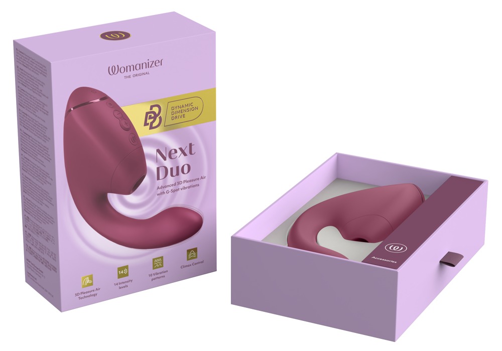 Der Womanizer Next Duo vereint die revolutionäre 3D Pleasure Air Technologie für die Klitoris mit kraftvoller G-Punkt-Stimulation – jetzt noch intensiver durch den neuen Dynamic Dimension Drive! Dieser nahezu lautlose (37 dB) Dual-Stimulator bietet ein völlig neues Level an gemischten Orgasmen: G-Punkt-Vibrationen und pulsierende Klitoris-Stimulation verschmelzen zu einer einzigartigen, tiefgehenden Erfahrung, die Orgasmen voluminös und anhaltend macht. Für intensive, individuelle Lustmomente, die tief unter die Haut gehen und lange nachklingen.