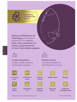 Der Womanizer Next Duo vereint die revolutionäre 3D Pleasure Air Technologie für die Klitoris mit kraftvoller G-Punkt-Stimulation – jetzt noch intensiver durch den neuen Dynamic Dimension Drive! Dieser nahezu lautlose (37 dB) Dual-Stimulator bietet ein völlig neues Level an gemischten Orgasmen: G-Punkt-Vibrationen und pulsierende Klitoris-Stimulation verschmelzen zu einer einzigartigen, tiefgehenden Erfahrung, die Orgasmen voluminös und anhaltend macht. Für intensive, individuelle Lustmomente, die tief unter die Haut gehen und lange nachklingen.
