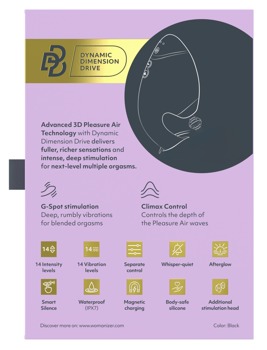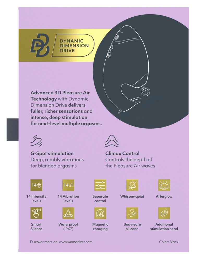 Der Womanizer Next Duo vereint die revolutionäre 3D Pleasure Air Technologie für die Klitoris mit kraftvoller G-Punkt-Stimulation – jetzt noch intensiver durch den neuen Dynamic Dimension Drive! Dieser nahezu lautlose (37 dB) Dual-Stimulator bietet ein völlig neues Level an gemischten Orgasmen: G-Punkt-Vibrationen und pulsierende Klitoris-Stimulation verschmelzen zu einer einzigartigen, tiefgehenden Erfahrung, die Orgasmen voluminös und anhaltend macht. Für intensive, individuelle Lustmomente, die tief unter die Haut gehen und lange nachklingen.