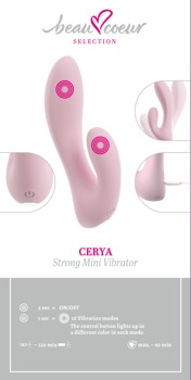 Der sinnlich geschwungene CERYA Strong Mini Vibrator von beau cœur verwöhnt mit seinen beiden Armen Vagina und Klitoris zugleich. Seine extrastarken Vibrationen gehen richtig tief, unter die Haut und direkt auf den Punkt. Mit 10 verschiedenen Vibrationsmodi ist für jede Laune und jeden Höhepunkt der richtige Speed dabei. Einfach nur aufs Knöpfchen drücken. Das perfekte Toy zum Kennenlernen dualer Stimulation und multipler Orgasmen!