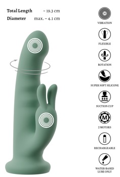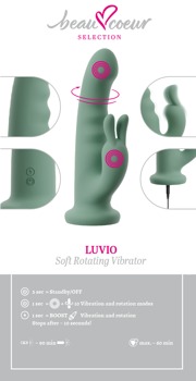 Handlicher, sinnlich designter LUVIO Soft Rotating Vibrator von beau cœur mit Saugfuss. Mit seinen 2 Motoren verwöhnt der leise Rabbitvibrator innen und aussen zugleich. Der mit sanften Rillen strukturierte Schaft rotiert mit seinem Vibrokopf in der Vagina für eine tiefgehende Stimulationsmassage. Dazu verwöhnt das flexible Vibro-Bunny intensiv die Klitoris und Vulva.