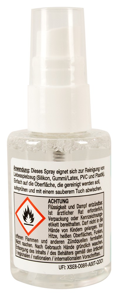 Reinigungsspray O-Toycleaner für Erotik-Spielzeug aus Silikon, Gummi/Latex, PVC und Plastik. Einfach aufsprühen und mit einem sauberen Tuch abwischen. Sehr ergiebig – schon wenige Sprühstösse reichen für eine perfekte Reinigung. Der 50-ml-Sprayer passt in jede Tasche – perfekt für unterwegs.
