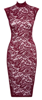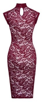 Enges tailliertes Kleid von Cottelli LINGERIE mit kleinem Stehkragen. Ärmellos und in knieumspielender Länge. Komplett aus feiner anschmiegsamer Ornament-Spitze in edlem Bordeauxrot. Rundum elastisch und weich für hohen Tragekomfort. Stehkragen mit Knopfverschluss im Nacken.