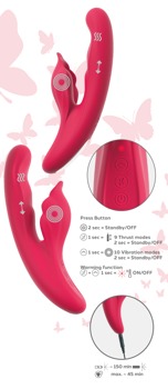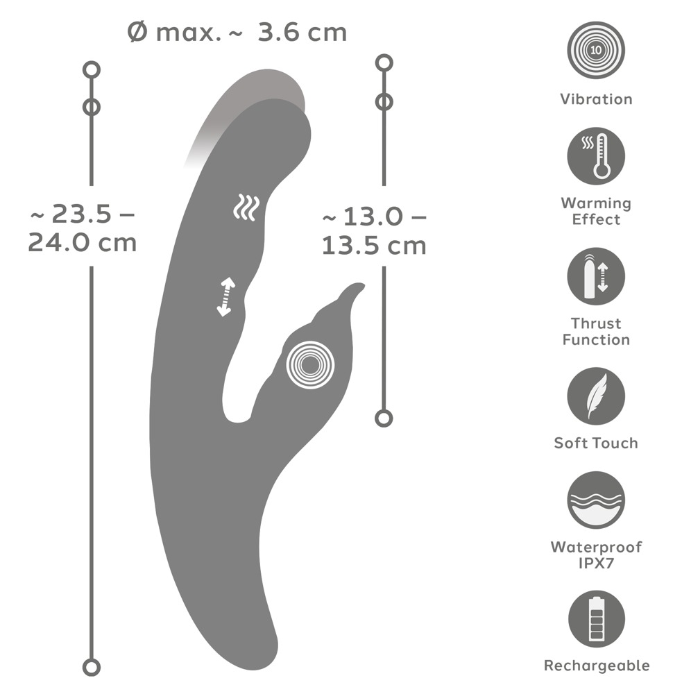 Gleich 3 leise, leistungsstarke Motoren sorgen für zuverlässige Wärme, eine Stosskraft über 0,5 cm und die Vibro-Power. 9 Stossgeschwindigkeiten im (erwärmten) Schaft und 10 Vibrationsmodi im soften Klitoris-Stimulator bieten abwechslungsreiches Spiel. Die Funktionen sind getrennt steuerbar und können so für ein individuelles Lustprogramm miteinander kombiniert werden. Alles bequem per Knopfdruck.