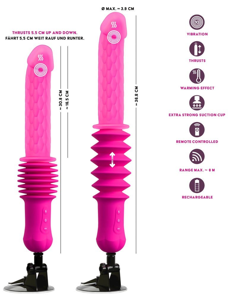 Die Stösse des Vibrators über eine Hublänge von über 5 cm sind in 3 Geschwindigkeiten steuerbar. Die Vibrationen in 10 verschiedenen Modi. Alles bequem per Fernbedienung (Reichweite 8 Meter) oder per Knopfdruck direkt am Toy – getrennt oder miteinander kombiniert. Noch mehr Genuss bietet die wohltuende Wärmefunktion bis zu 42°C. Sie erwärmt schnell das seidig-weiche Dual Layer Silikon für besonders geschmeidiges Gleiten und intensives Empfinden.