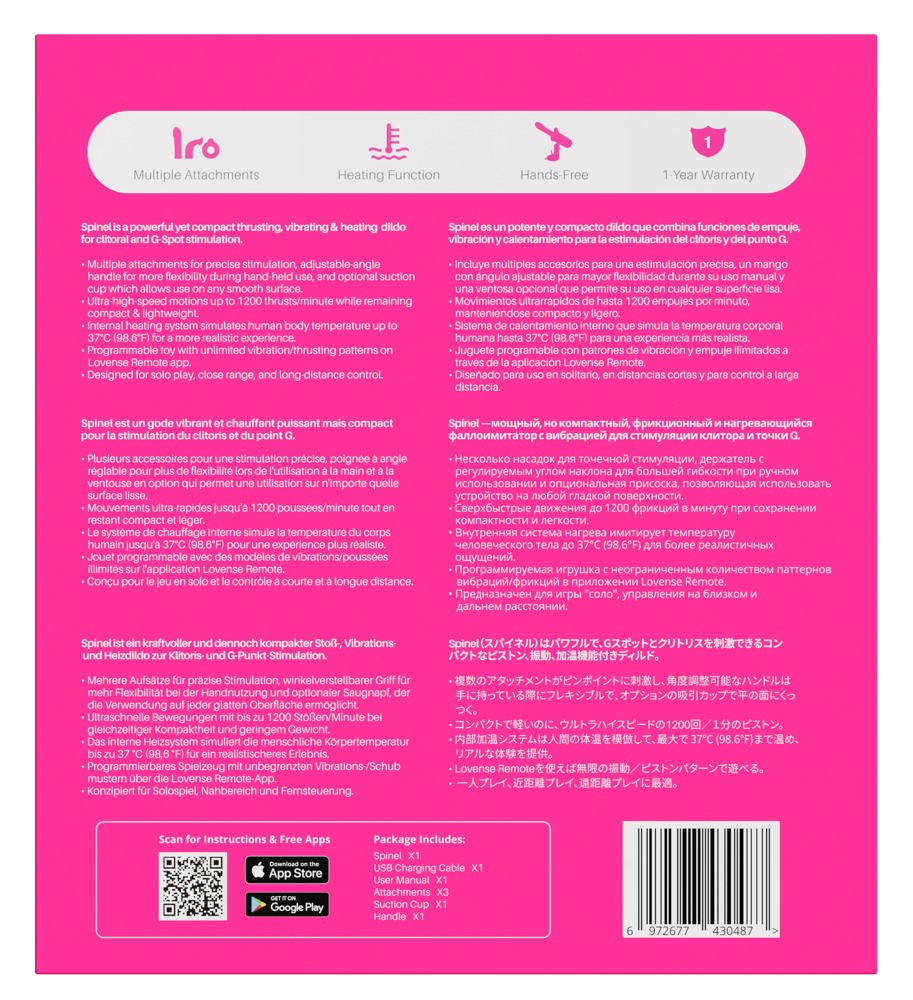Leichter, kompakter App-Controlled Portable Thrusting Vibrating & Heating Dildo Spinel von Lovense mit Stoss-Funktion, Vibration und Wärme-Funktion. Verwöhnt mit extra starker Power und vielseitigem Zubehör auf sehr intensive, abwechslungsreiche und komfortable Weise. Beiliegender gerader Dildo-Aufsatz, der gebogene G-Punkt-Aufsatz sowie der Klitoris-Stimulator sind schnell am Basisgerät angebracht und ausgetauscht. Genauso wie der praktische Griff und der verstellbare Saugfuss. So ist für jede Lust und Laune der stylische Spinel schnell einsatzbereit – beim Spiel allein und zu zweit, zuhause und unterwegs!