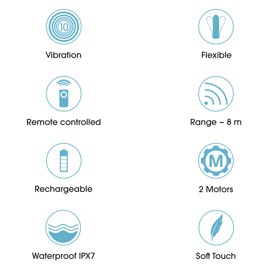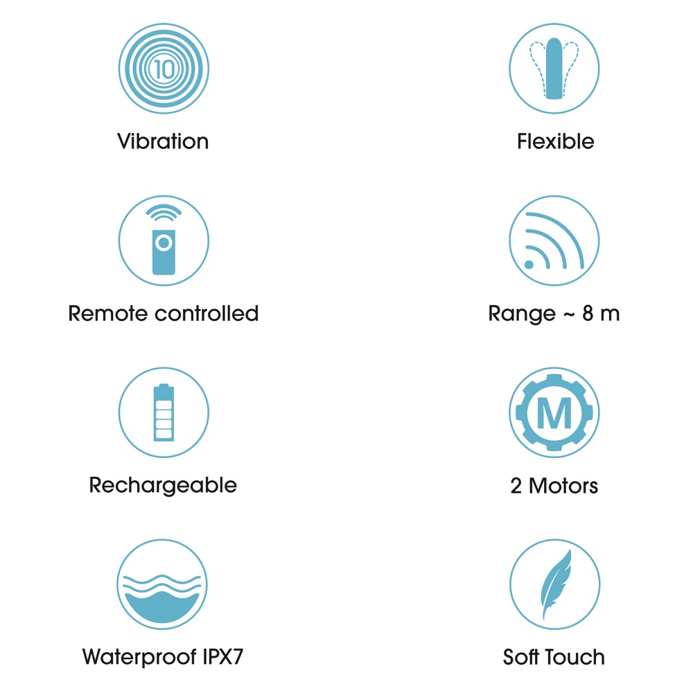 2 leise Motoren gewährleisten intensiven Vibro-Doppelspass, 10 verschiedene Vibrationsmodi bieten dabei vielseitigen Genuss. Mit der praktischen Fernbedienung (Reichweite 8 m) lassen sich die Impulse von beiden bequem steuern. Die Vibrationen können auch direkt am Doppelvibrator per Knopfdruck gesteuert werden. Sogar in Bad und Dusche, denn der Dual-Vibrator ist wasserdicht.