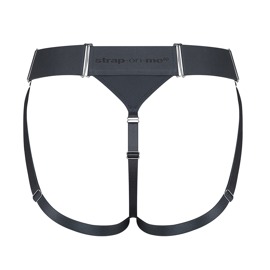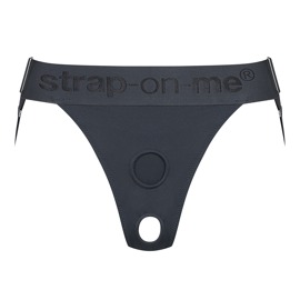 Grauer Unique Lingerie Harness von Strap-on-me aus weicher Mikrofaser im bequemen Jock-Style. Vorne doppellagig gearbeitet und mit Einschub, sowie eingearbeitetem Haltering zum Einsetzen eines Dildo/Vibrators mit Saugfuss – auch Doppel- und Triple-Toys lassen sich fest platzieren. Der Stretchbund und die elastischen Jock-Straps sind passend verstellbar. So sitzt alles fest und sicher bei Rollenspielen, Pegging und Co.