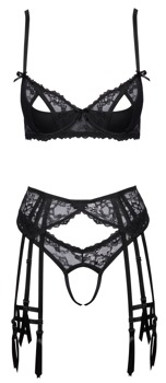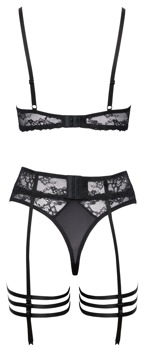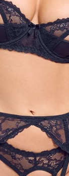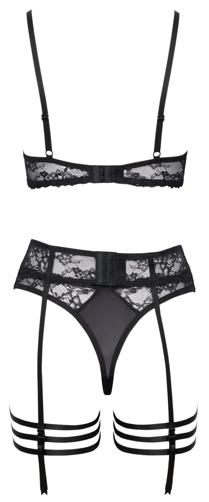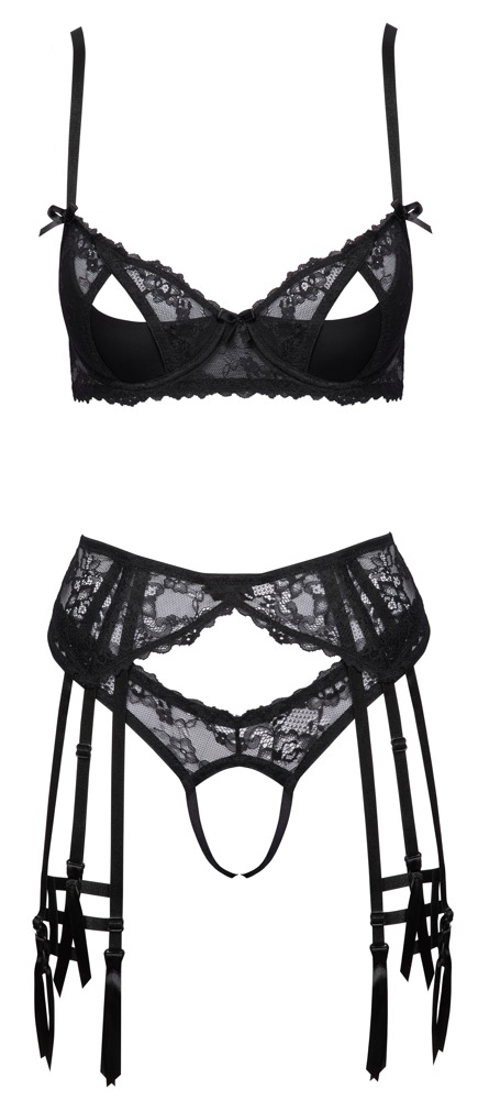 Schwarzes Straps-Set von Cottelli LINGERIE mit Bügel-BH, Strapsgürtel, Riostring und stylischen Strumpfbändern. Mit feiner weicher Stretch-Spitze gearbeitet, Strumpfbänder aus soften Stretchbändern. Bügel-BH mit halben Cups, darüber Spitze mit verführerischen Cut-outs. Die BH-Träger und der Hakenverschluss im Rücken sind passend verstellbar. Genauso wie der Hakenverschluss hinten im Taillen-Strapsgurt und die insgesamt 8 Strumpfhalter (6 vorne, 2 hinten). Der Riostring verführt mit einer offenen Front.