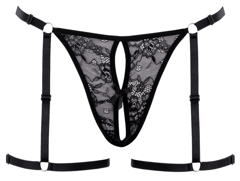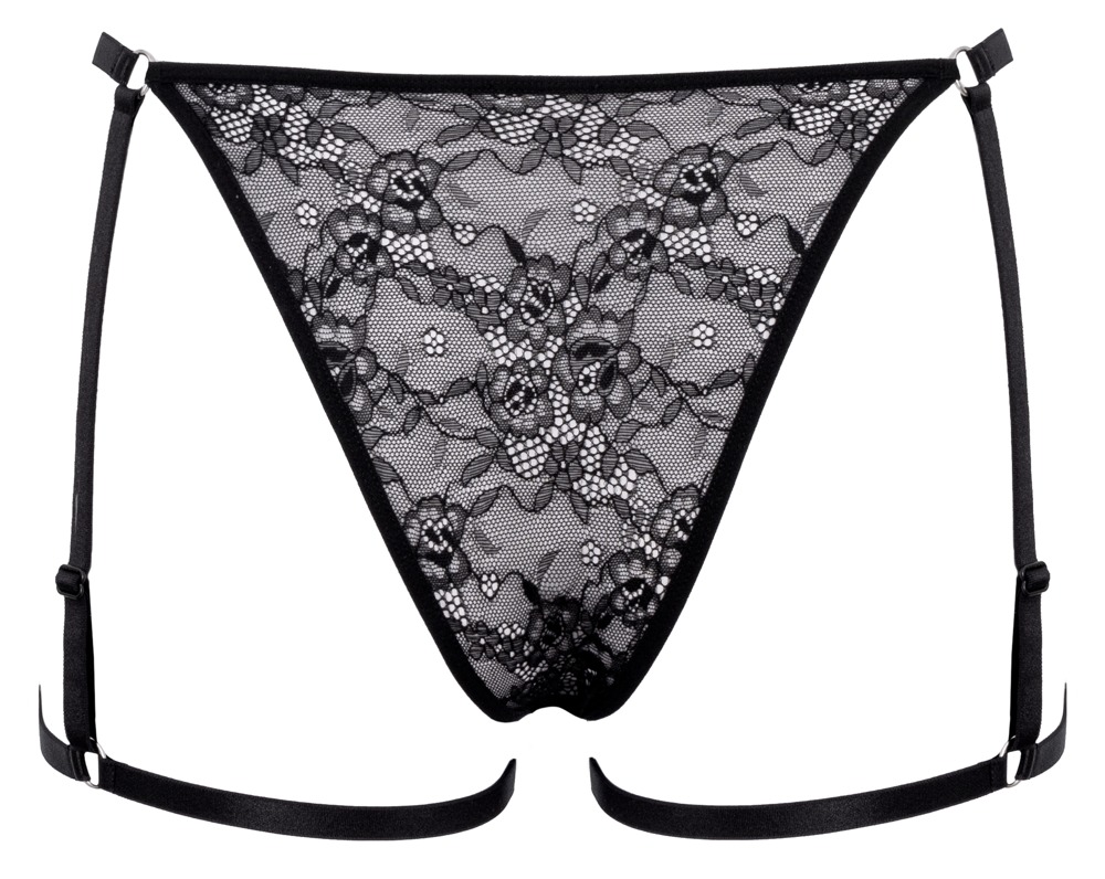Schwarzer Straps-Slip von La Finesse DESSOUS aus weicher elastischer Spitze. Vorne verführerisch geschlitzt und mit kleiner Satinschleife verziert. Die Strapse mit den Schenkelriemen sind fest am Spitzen-Slip angenäht. Strapse, Schenkelriemen und Riemenbund jeweils seitlich passend verstellbar.
