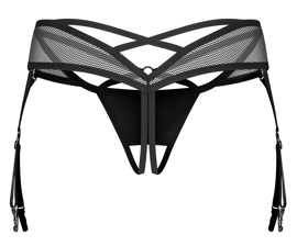 Schwarzer Straps-String ouvert Dominna von Obsessive im stylischen Mix aus feinem Netz und stilvollem Wetlook. In extravaganter Optik mit elastischen Riemchen, Ring und kleinem Schmuckelement vorne. Raffiniert sind auch die gekreuzten Strumpfhalter jeweils seitlich. Die 4 Strumpfhalter sind passend verstellbar – und auch komplett abnehmbar. Im Schritt verführerisch offen.