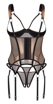 Busenfreies Strapshemd Soranna von Obsessive inklusive String ouvert. In bronzefarbener Semitransparenz mit edlem Schimmer. Schwarze Details und dekorative Ringe setzen stylische Akzente. Rundum elastisch und weich anschmiegsam für besten Tragekomfort. Der freie Busen wird von Riemchen sinnlich umrahmt und mit leicht gepolsterten Bügel-Cups perfekt in Szene gesetzt. Die Träger und Strumpfhalter sowie die Hakenverschlussleiste im Rücken sind passend verstellbar. Der verführerische schrittoffene String komplettiert das aufregende Ouvert-Duo.