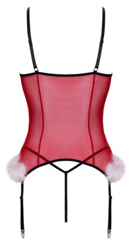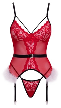 Strapshemd und String im Set X-Mas von Cottelli LINGERIE. Rotes Powernet und feine Spitze Ton in Ton. Rundum weich und elastisch für vollen Tragekomfort. Dazu schwarze Details und zarter weisser Federbesatz seitlich an den Hüften. Spitzen-Cups mit schmalen Cup-Riemchen, in der Taille vorne ein dekorativer aufgesetzter Ziergürtel. Die Träger und Strumpfhalter sind passend verstellbar. Der kleine Spitzen-String komplettiert den verführerischen Festlook.