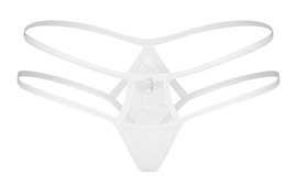Betonender, weisser String Arrowel von Obsessive mit feiner, bestickter Spitze und kleinem Schmuckdetail vorne. Auch der hintere Rauten-Ausschnitt ist mit Spitze verziert. Dazu weiche elastischen Riemen für hohen Tragekomfort.