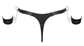 Schwarzer Riostring von Svenjoyment Bondage inklusive Soft-Handfesseln. Im Mattlook mit silberfarbenen Metall-Accessoires. Weich und elastisch für besten Tragekomfort. Rio in der Front mit dekorativen Nieten bestückt. Bund vorne sowie seitlich mit Ringen, an denen die beiliegenden Handfesseln mit ihren Karabinerketten schnell eingehakt sind. Die soften Mattlook-Manschetten sind mit Klettverschlüssen schnell angelegt und angepasst.
